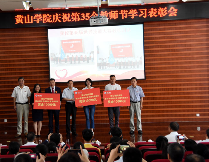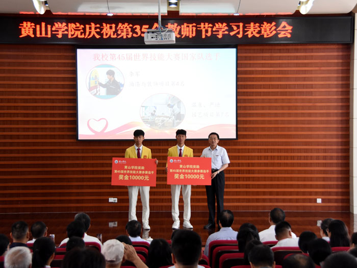 9月10日上午,我校在南区逸夫图书馆二楼报告厅召开以“庆祝新中国七十华诞,弘扬新时代尊师风尚”为主题的2019年教师节学习表彰会,庆祝第35个教师节。校党委书记汪枫,党委副书记、校长李铁范,副校长胡善风,党委委员、副校长刘英旺,党委委员、纪委书记陈家祥出席会议,全体处级干部,第45届世界技能大赛参赛选手及教练、翻译团队,第46届世界技能大赛学校集训队及师生代表参加会议。胡善风主持会议。