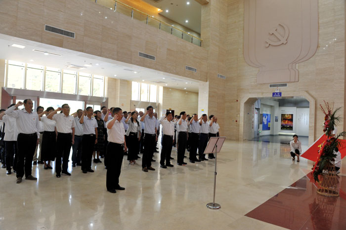 “我志愿加入中国共产党,拥护党的纲领,遵守党的章程履行党员义务,执行党的决定,严守党的纪律,保守党的秘密,对党忠诚,积极工作,为共产主义奋斗终身,随时准备为党和人民牺牲一切,永不叛党。”在庄严的党旗面前,读书班全体学员重温了入党誓词。校党委书记汪枫满怀崇敬之情,瞻仰了将军的雕塑,敬献花篮,整理缎带,行鞠躬礼。