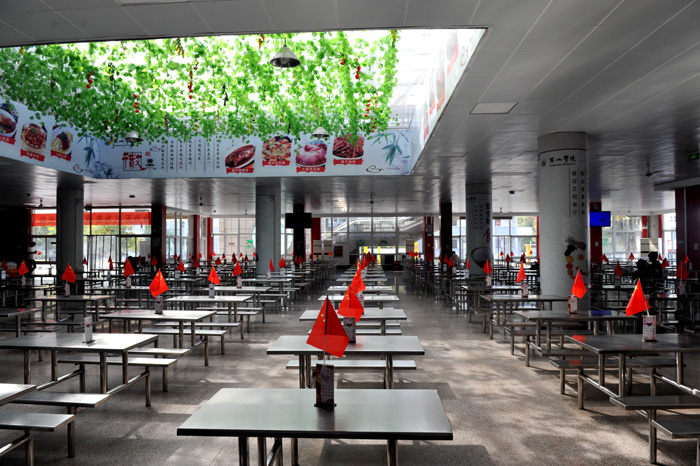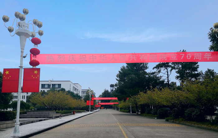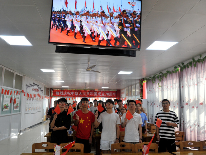 举国同庆的日子,校园处处洋溢着浓浓的喜庆气氛。学校门口精心布置了美丽的花坛,校园主干道挂上了“热烈庆祝中华人民共和国成立70周年”的横幅、道旗和大红灯笼,校园内的电子屏滚动播放着庆祝新中国成立70周年的宣传语,食堂内红旗飘飘,餐桌上也插上了鲜艳的五星红旗。