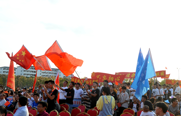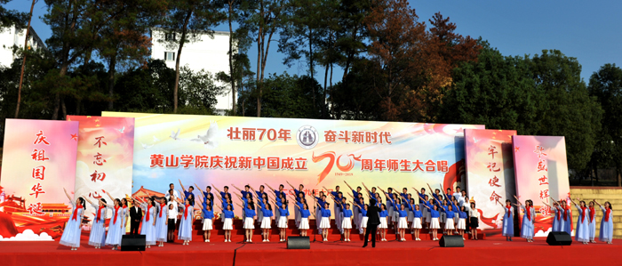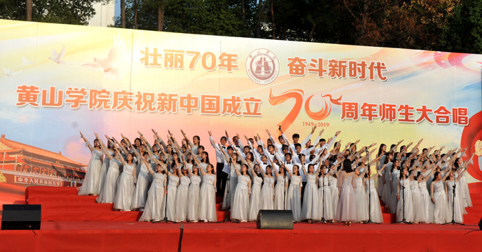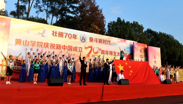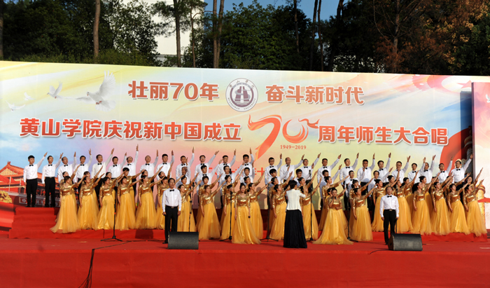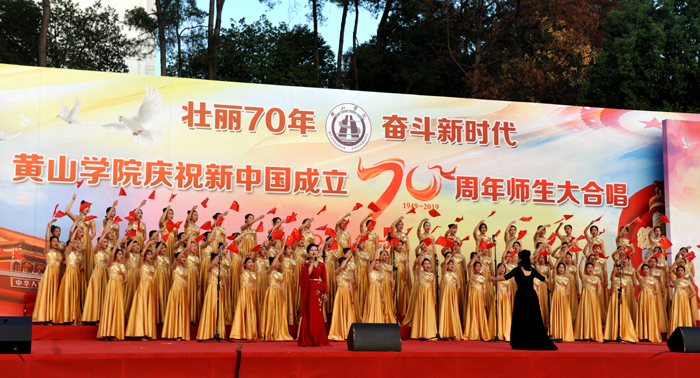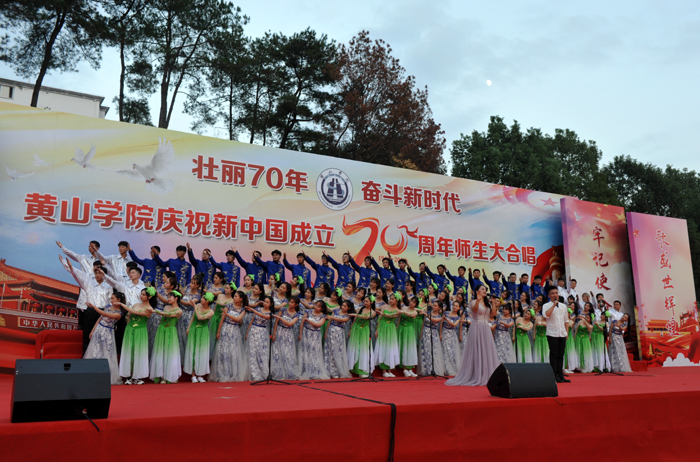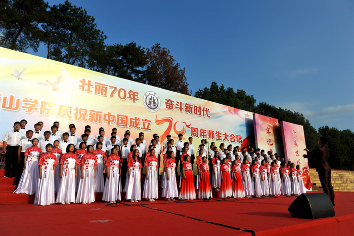 演出现场,16支代表队用满腔的热情、嘹亮的歌声唱响中国梦,抒发对伟大祖国的热爱、祝福和赞美之情。各代表队激情洋溢,离退休老教师、各学院师生等纷纷登台演唱,体现了全校上下同心协力,共庆新中国成立70周年的澎湃激情。一开场,在艺术学院老师纪恺和魏慧莉的带领下,台下近万名师生共同唱响《我和我的祖国》,以深情的歌声拉开了活动的序幕。