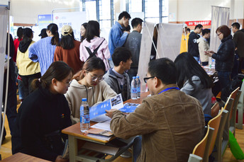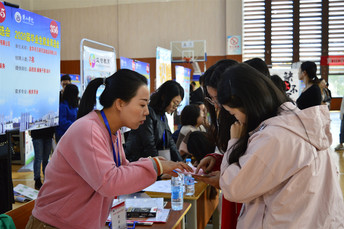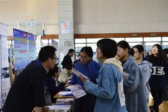 在双选会现场,求职学生积极与招聘人员进行交流,详细咨询用人单位提供职位要求等相关信息;招聘人员热情介绍单位背景、用人制度、岗位需求、企业培训和晋升体系等相关信息。