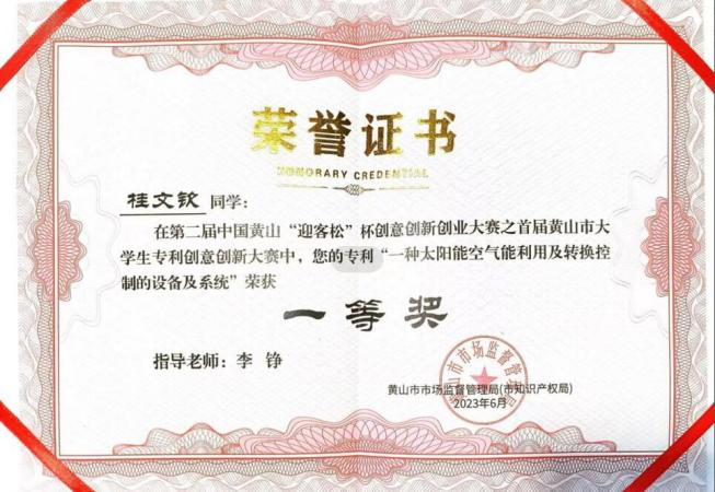 桂文钦同学荣获首届“迎客松”杯黄山市大学生专利创意创新大赛一等奖,第一发明人授权专利1项。