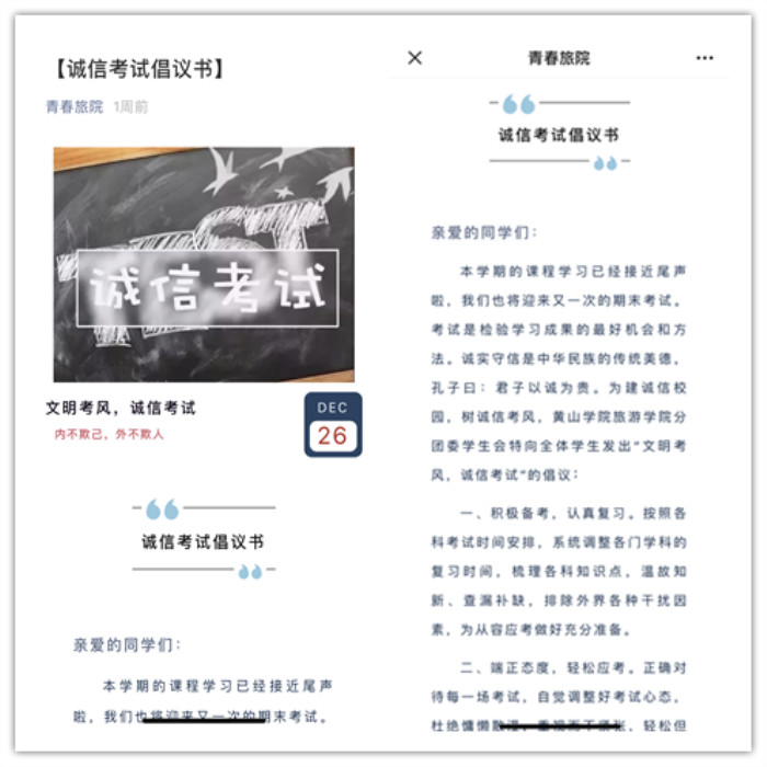 该院团总支通过院网、微信公众号发出《诚信考试倡议书》,通过“理性认识,科学备考”“慎思明辨,防微杜渐”“遵守纪律,共创和谐”等三个方面告诉同学们认真对待考试、学会制定合理复习作息、抵制一切不正之风、遵守考场纪律和考试规则等。倡导同学们要拒绝作弊的陋习,树立诚信意识。