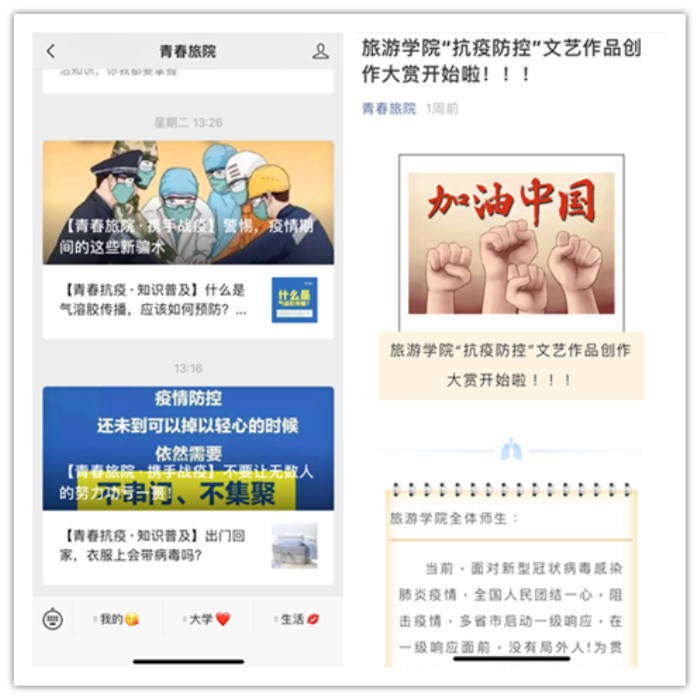 为响应党中央、团中央立即行动起来、投身疫情防控的号召,该院迅速行动,公众号上开设【青春旅院·携手战疫】、【青春战疫·知识普及】等专题,大力宣传科学防控知识举措,转发官方权威信息,抵制谣言,构建清朗网络空间。并且面向全院师生开展以“防控抗疫”为主题的文艺作品创作活动,分为美术类、设计类、征文类作品,作品要求凝心聚力、青春向上、宣传病毒预防知识等,为打赢疫情防控阻击战贡献文化力量。
