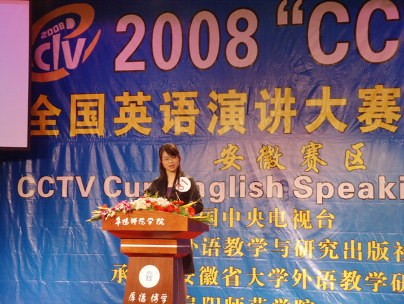 10月18日,2008“CCTV杯”全国英语演讲大赛安徽赛区复赛在阜阳师范学院举行。来自外语系的李子骏以命题演讲第一的优秀成绩荣获了本次比赛的一等奖,这是我校参加CCTV英语演讲比赛以来取得的最好成绩。来自化学系的丁成立荣获优胜奖。此次比赛有来自本省31所高等院校的72名选手参加角逐,高手云集,竞争激烈。我校两名选手由外语系王巧老师带队参赛。“CCTV杯”全国英语演讲大赛是检测大学生英语能力的最高规格比赛,备受各地高校和社会的关注。
