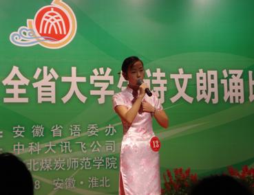 在18日结束的第三届“讯飞”杯全省大学生诗文朗诵比赛中,由我校语言文字工作委员会选送、吴敏老师指导、06公管班黄荣同学参赛的《放我的手在你掌心》获得一等奖。