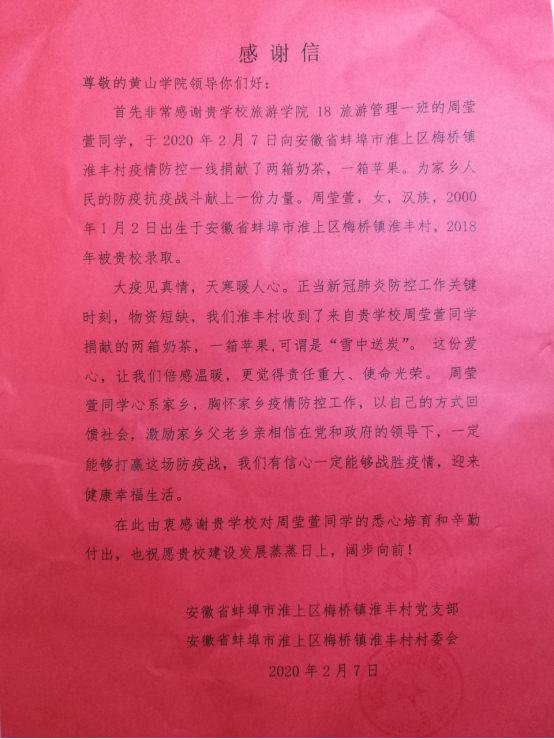 2月7日,旅游学院18级旅游管理1班周莹萱同学向安徽省蚌埠市淮上区梅桥镇淮丰村疫情防控一线捐献了两箱奶茶、一箱苹果,为家乡人民的防疫战斗贡献自己的一份力量。周莹萱同学是00后,2018年被博业体育(中国)官方网站-登录入口旅游管理专业录取,出生在安徽省蚌埠市淮上区梅桥镇淮丰村。本着响应该院旅游管理第一党支部“积极防疫、为战疫做贡献”的号召,向淮丰村疫情防控一线表达了自己的一片心意。周莹萱同学心系家乡,关注家乡疫情防控工作,以自己特有的方式回馈学校和国家的培养。她不仅受到当地政府和党委的肯定和好评,也受到该院领导和老师的一致表扬,为我校赢得了美誉。