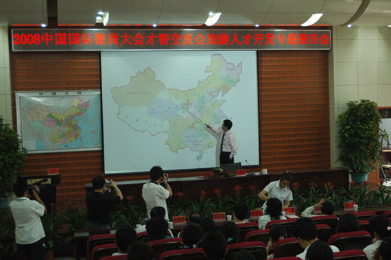 5月18日,我校逸夫图书馆二楼报告厅笑声不断,掌声连连,中国国际徽商大会才智交流会旅游人才开发专题报告会在此举行。大会邀请新加坡华鼎集团总裁、国家外国专家局特聘外国专家李良义作主题为《用文化创意打造旅游品牌----旅游发展战略与旅游人才开发》的学术报告。省人事厅、旅游局、外专局负责人,以及各市人事局、外专局、旅游局和旅游企业代表,我校旅游专业师生共300人出席了会议。报告会由省外专局局长葛余清主持。