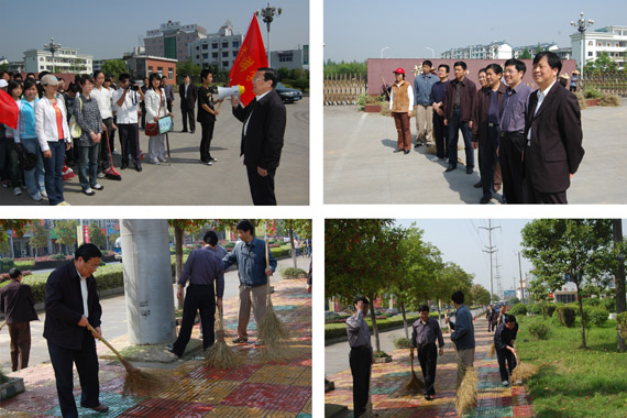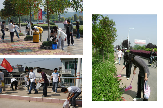 活动开始后,在学校领导、院系领导的带领下各单位都准时到达指定位置,广大师生一起动手打扫卫生。大家有的用扫帚清扫树叶和碎纸,顿时散乱的杂物集成了堆;有的一手拎着垃圾篓,一只手在地上捡起扫不动树枝和绳子,一会工夫塑料袋就被装得满满的;有的还蹲在绿化带旁,帮助园林工人认真地将草坪中的杂草拔除;还有许多同学围着公交站牌、路灯杆子进行擦洗,他们的举动引来周围市民的连连称赞。