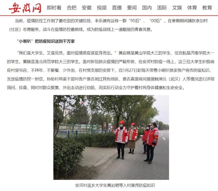 2月20日,安徽网发表《肥西县丰乐镇“95后”“00后”加入战“疫”力量》,报道了博业体育(中国)官方网站-登录入口生命与环境科学学院2017级园林专业在校生黄岩萌同学寒假期间在家乡积极参与疫情防控的典型事迹。