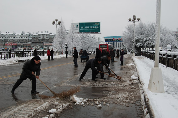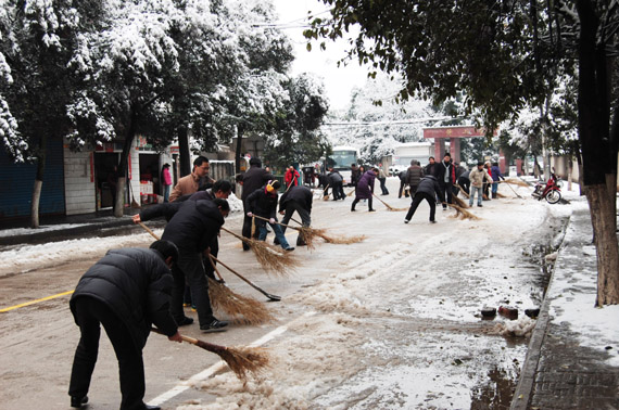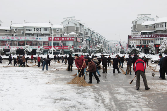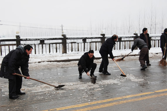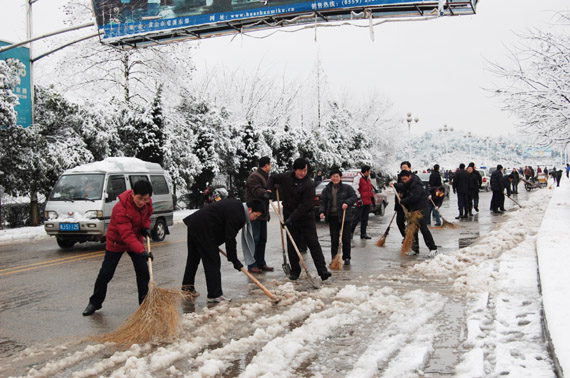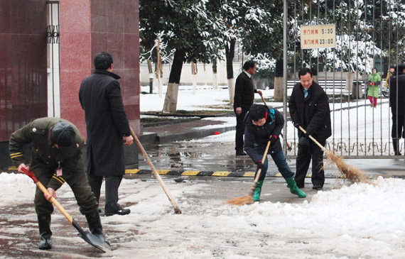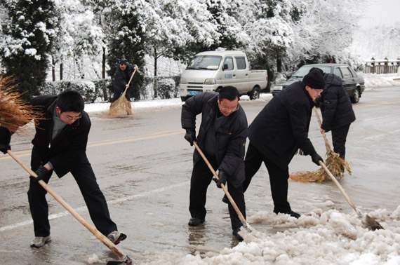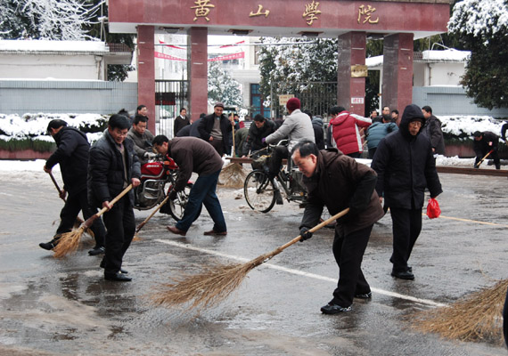29日上午十时,校党委书记汪良发、副院长汪大白、纪委书记吴邦贵等校领导率领各部门、各院系100多名干部职工先后到达横江大桥、博业体育(中国)官方网站-登录入口北区迎宾大道新大门处、北区戴震路老大门处以及附近周边地段,义务清扫、铲除道路积雪。竹子大扫把扫不动就用铁锨铲,用锄头挖。一开始工具不够用,大家争先恐后轮番上阵。而对于厚重的积雪,就三五人一组并排齐用力推行清除。不少老师的鞋子浸湿了,没有人抱怨喊冷。到上午十一点半,积雪清除,道路恢复畅通。汪良发书记肯定了同志们的奉献精神,并向大家问候致意。