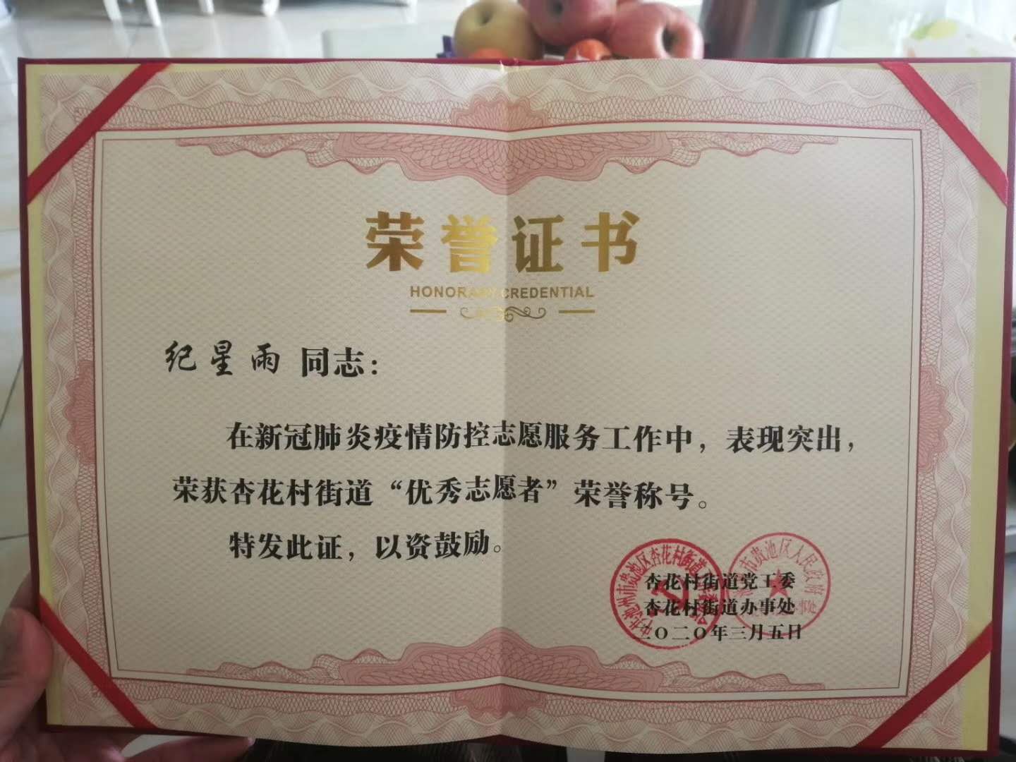 疫情就是命令,防控就是责任。我校旅游学院学子纪星雨坚守在家乡疫情防控第一线,因工作认真负责、表现突出,被评为“优秀志愿者”。