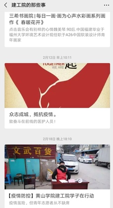 该院团总支积极通过微信公众号,QQ空间和易班等新媒体媒介积极宣传防疫抗疫知识,积极动员各团支部开展防控疫情知识线上学习,召开“从我做起,科学防疫”线上专题支部会,积极了解建工学子在抗击疫情方面表现突出的同学并积极宣传。