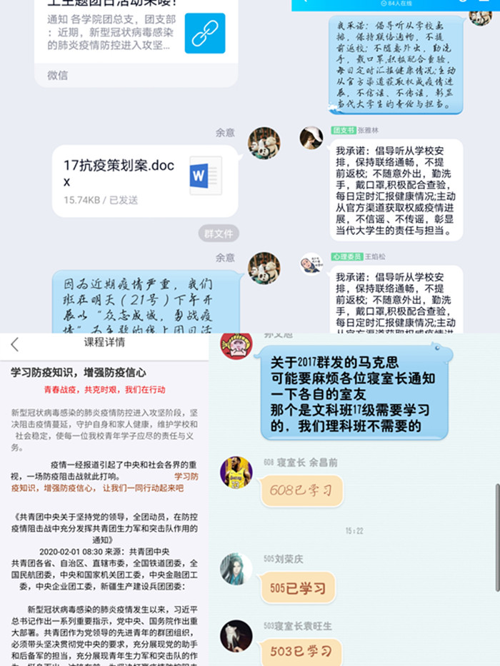 线上学习活动。活动中,各团支部利用团支部微信群、QQ群等,组织动员团员青年开展防控疫情知识线上专题学习。重点学习了习近平总书记在1月25日和2月3日在中共中央政治局常委会上的重要讲话精神、《共青团中央关于坚持党的领导,全团动员,在防控疫情阻击战中充分发挥共青团生力军和突击队作用的通知》《教育部致全国大学生的一封信》《安徽省教育厅致全省广大学生和家长的一封信》以及《博业体育(中国)官方网站-登录入口疫情防控期间消防安全倡议书》等内容。