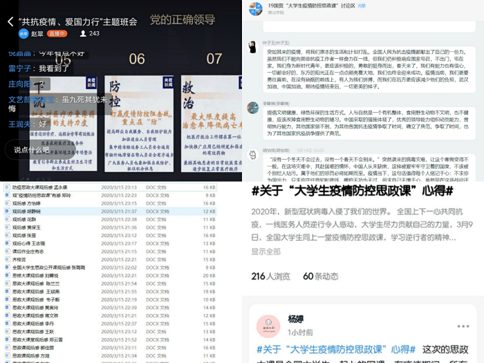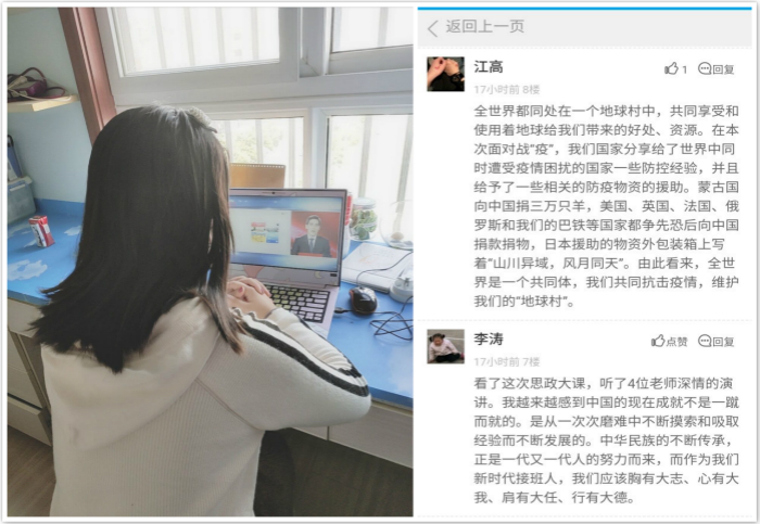 直播结束后,各班辅导员积极组织召开“疫情防控思政大课”学习交流主题班会。同学们纷纷表示,在举国上下万众一心、众志成城做好新冠肺炎疫情防控工作的特殊时刻,疫情防控“思政大课”就像是一场对大学生思想政治教育的“及时雨”,对学生来说是一场思想的大洗礼,更是一次很宝贵的提升;同学们坚信在中国共产党的正确领导下,中国人民万众一心,众志成城,一定可以战胜病魔。