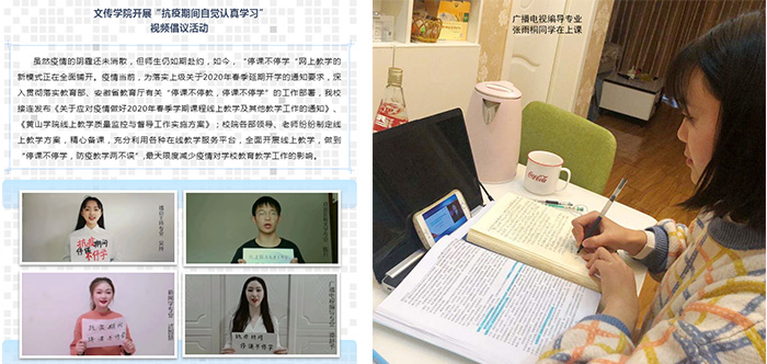 该院还组织开展“抗疫期间自觉认真学习”的视频倡议活动,新闻学、广播电视编导、戏剧影视文学、播音主持等4个专业学生代表通过摄像镜头以音视频形式,倡议全校学生在疫情防控的非常时期,有效利用网络平台,紧跟老师步伐,在家如校,自觉自律,保证学习效果。
