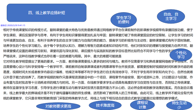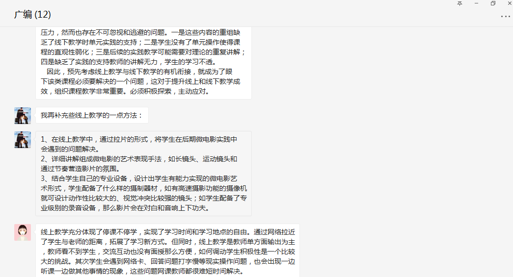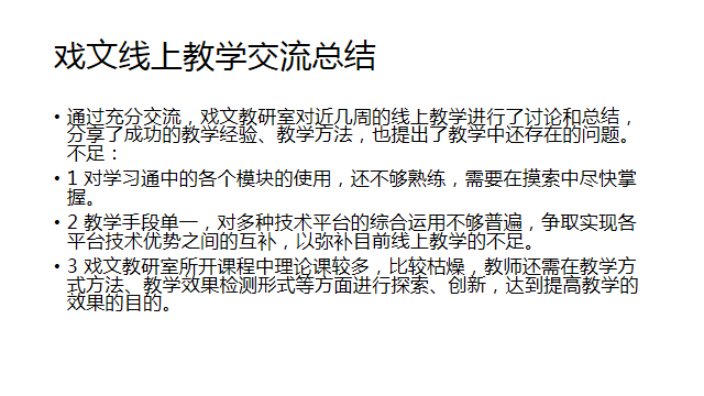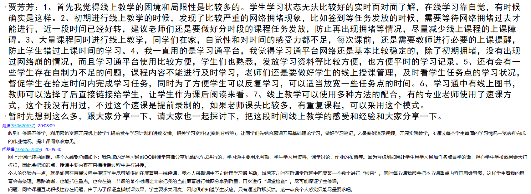 活动中,大家踊跃发言,各抒已见,讨论内容充实,有针对性,既指出线上教学的优点,也指出存在的不足,对存在的问题提出意见和建议。大家认为,一场疫情让互联网技术全面、深入融入日常教学这一正在推行的教学模式得以提前实施。开展线上教学工作既是考验也是促进,该院许多教师都摸索出自己的经验做法。大家纷纷表示,待学生返校正常上课后,线上教学好的方法还要保留,做到线上线下相结合,努力打造该院的“智慧课堂”。该院领导对教研室的活动给予充分的肯定,为教师们积极热情地参与活动点赞,并希望教师们更加积极探索适应新时代该院教学的新理念与新举措。