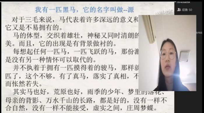 各主讲人通过简洁明了的语言,生动形象地向同学们阐释了自己所读书籍。韦欣煜同学分享的《送你一匹马》,通过作品背景和内容介绍引伸到作家三毛的日常生活和人生“三观”;都佳丽同学分享的小说《八十天环绕地球》,讲述了作家凡尔纳笔下的福克先生良好的生活习惯和果断的行事态度;赵皖霞同学向大家分享了《看见传承》,她以诸葛亮写给儿子的《诫子训》家书为导引,结合当下中国抗“疫”斗争实际,呼吁大家要传承中华优秀传统文化;曹颖同学分享的《如何阅读一本书》,告诉我们什么是阅读、为什么要阅读和怎样阅读。