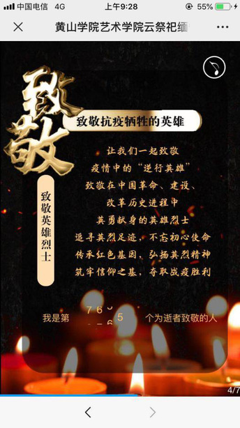在新冠肺炎疫情即将取得全面胜利的时刻,缅怀先烈,祭扫英烈,弘扬英烈精神传承红色基因,艺术学院党委制作云祭祀小程序,参与在线祭奠,向英烈们表达敬意、寄托哀思,体会家国情怀,为传统优良文化的传承和发展,献出自己的一份力量。