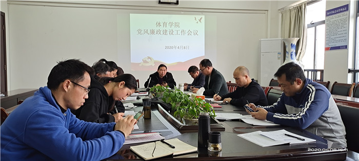 4月8日,体育学院召开2020年党风廉政建设工作会议。该院党总支副书记刘双四、副院长张俊、科级干部、各党支部书记、教研室主任、实习实训中心主任、行政人员等在院会议室参加会议,其他党员及非党员教职工通过腾讯会议参加了视频会议。会议由学院党总支书记杨和健主持。