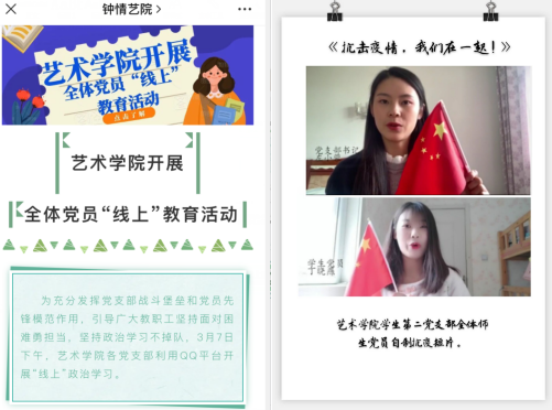 针对疫情防控期间广大师生党员居家学习的实际情况,学院党委积极思考、加强探索,着力织密织好“网上党支部”组织生活体系,确保特殊时期的“规定动作”跟得上、有质量。师生党支部依托学习强国、微信、钉钉等平台,以线上主题党课为抓手,积极开展“微党课”活动,促进党员不断加强党性锻炼,提高政治觉悟。此外,师生党支部拓展“主题党日”的内容和形式,强化活动后的跟进宣传,通过“钟情艺院”微信平台、宣传条幅、新闻宣传载体,发布40余篇新闻报道,全方位展示疫情防控期间党支部的工作动态,积极传播正能量。