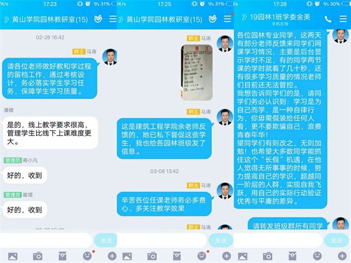 园林教研室组织教师密切关注学校的疫情防控工作专栏,开课前,通过教研室QQ群多次动员教师主动思考新形势下教学质量保障问题;开课后,鼓励教师将教学过程中遇到的问题反馈给教研室,并在教研室群内进行探讨;针对课程开始初期部分学生学习效率不高的问题,教研室紧急发动任课教师和各班级学习委员进行全员动员,优化专业学风;在疫情得到一定程度控制之后,教研室组织全体成员现场观摩典型教师网络授课,并进行讨论和总结,优化下一阶段各课程教学方式、方法。