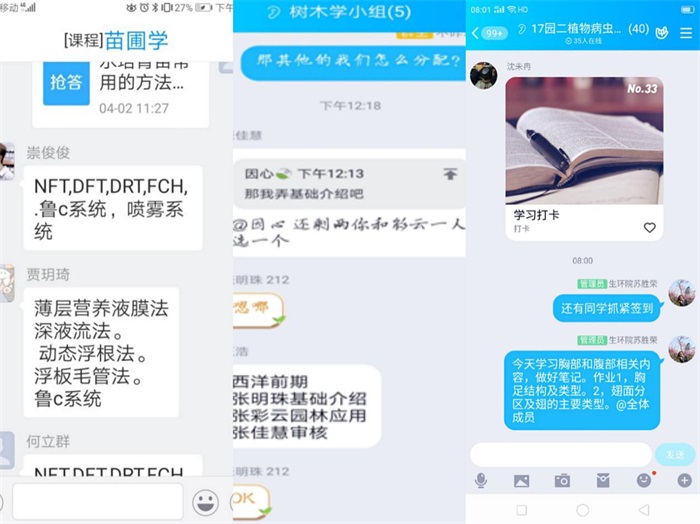园林教研室目前开设在线课堂10门,主要通过超星泛雅、学银在线、雨课堂、中国大学MOOC、QQ群课堂、钉钉视频会议等平台,采用MOOC视频学习、在线直播授课、线上讨论、定期在线答疑等多种形式混合开展线上教学活动。任课教师在充分调研各平台课程资源的基础上,结合各门课程的特征以及学生开展网络课程学习的条件选择教学平台与授课方式,确保特殊时期教学质量不打折。如《园林树木学》《苗圃学》《园林工程》《园林植物病虫害防治》《城市生态学》等课程选用国家级精品课程或专业领域名校开设的课程,其中《园林植物病虫害防治》《城市生态学》两门课灵活选用不同学校的课程资源作为不同章节的教学内容;《花卉学》《园林工程预决算》《园林专业创新创业课程》则借助于各种网络平台采用直播方式授课,其中《园林专业创新创业课程》充分利用钉钉视频会议平台,邀请多位企业导师开展线上教学,大大方便了企业导师“来校”授课,从一定程度上发挥了网络教学的优势;《画法几何与阴影透视》课程抽象、难以理解,任课教师调研得知18级园林专业部分同学网络不稳定,于是结合课程特点,采用录播方式,方便同学们多次回放学习或缓冲播放学习。