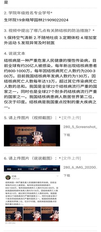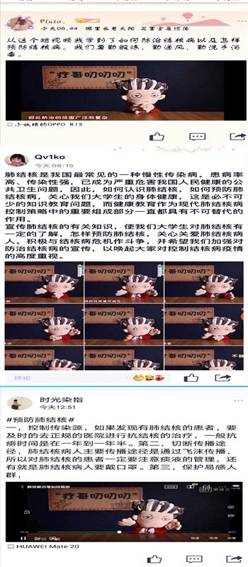 活动过程中,组织者在活动QQ群分享关于肺结核防治相关知识的视频,参与的同学观看视频后在群内完成有关肺结核问题的调查问卷,同时还需在QQ空间上发布一条观看视频的感受,谈谈对肺结核防治的认识。组织者们还针对同学们提出的问题进行答疑解惑,并鼓励同学们居家期间要加强体育锻炼,做好日常的防护措施。同学们也纷纷表示会将预防肺结核的相关知识转达给自己的家人,提醒他们增强防范意识。
