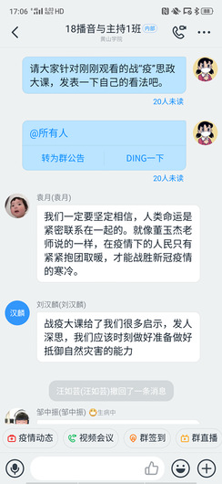 2019级广播电视编导专业邰旋同学表示:“思政大课使我受益匪浅,让我感受到在战“疫”中践行人类命运共同体理念的重要性。疫情期间,中国担当作为,我们筑起了防线,赢得了信任,分享了经验,彰显了担当。在疫情面前,世界人民要守望相助,病毒没有国籍,防控没有国界。作为新时代青年,我们应该坚定理想信念,志存高远,放飞青春梦想,胸怀世界,放眼全球,共创未来。”