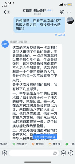 4月23日,一堂特殊的课程——“全省大学生同上一堂战‘疫’思政大课”以网络视频教学的方式开讲,文传与传播学院组织该院近千名学生在线同步收看,引导广大青年学生正确认识和看待此次战“疫”,树立责任担当意识,激发爱党爱国爱社会主义深厚情怀。