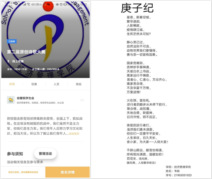 4月22日,经济管理学院通过钉钉举办了一场以“共抗疫情,爱国力行”为主题的线上诗歌创作大赛,该院600多名学生踊跃参赛。