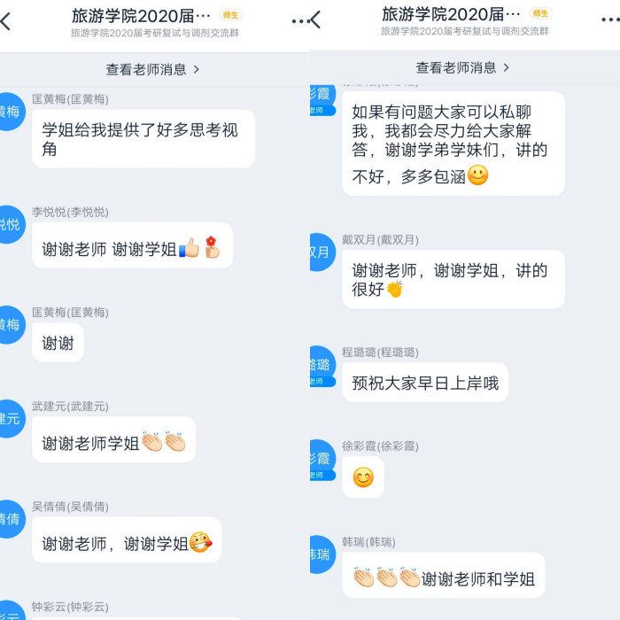 活动伊始,该院对通过初试的同学表示祝贺。程璐璐老师就考研准备和复试准备两个部分与在线的同学进行经验分享,详细介绍了复试的流程和需要注意的问题以及技巧。该院15级旅游管理活动专业徐彩霞同学(现就读于南京财经大学)分享了个人考研复试经验和选择调剂院校的过程。活动的最后,曹双剑对此交流会作出总结,并代表学院对学生提出殷切希望,预祝学生复试顺利。
