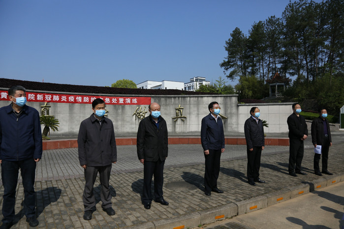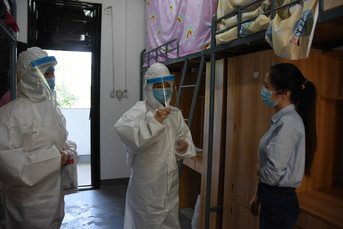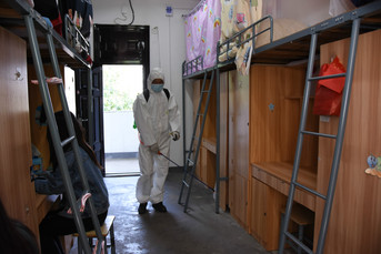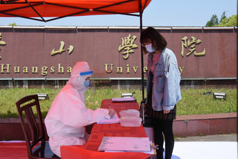 在学生宿舍出现异常情况演练环节,一名学生体温异常,辅导员第一时间上报,安抚其他同学情绪,宿舍其他学生戴口罩在本宿舍内等候,并要求该学生佩戴口罩等候防疫专车和专业医护人员接诊,医护人员随后登记学生信息、联系黄山市人民医院发热门诊、随车陪送发热学生就诊,并对该宿舍进行消杀。