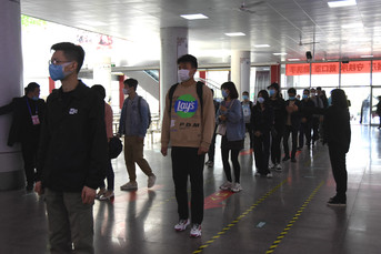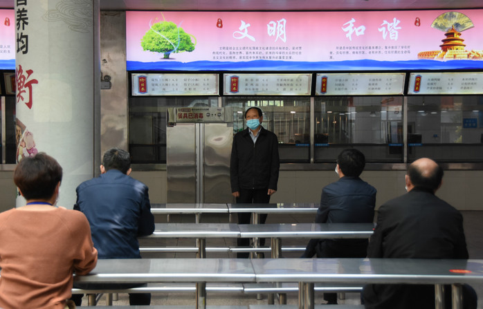 在食堂就餐演练环节,学生依次排队进行体温检测和手部消毒,无异常者方可进入。购买饭菜时,按地面标识间隔有序在售卖窗口排队等待,就餐学生全部同向、间隔而坐,用餐完毕后,戴好口罩收拾餐盘,有序排队将使用过的餐具摆放至餐具回收处,并在食堂出口处的洗手池洗手后离开。