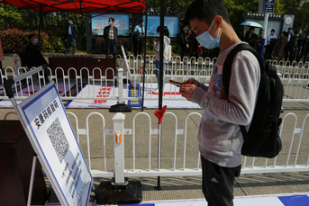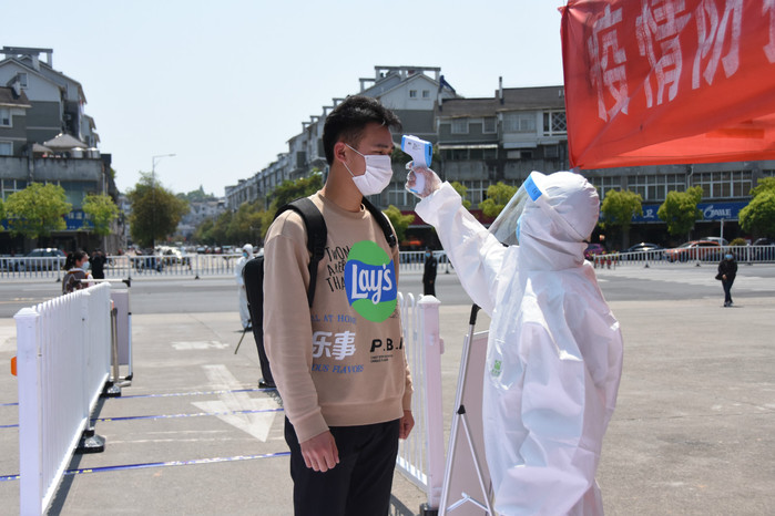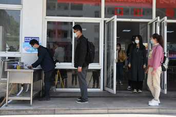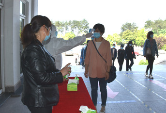 学校大门是校园疫情防控的第一道重要防线。演练现场,设置了人员进出通道2条。安保人员引导接站车和私家车停靠指定区域,劝离家长。人员进出通道处,每一位学生在等待测温区保持1米距离有序排队,体温正常、无其他症状者,进行手部消毒并扫描安康码、易通码后方可进校;体温异常者,医护人员迅速将其带至临时观察点进行体温复测并登记信息,随后联系黄山市人民医院发热门诊并陪送发热学生就诊,随即对临时观察点进行消毒。