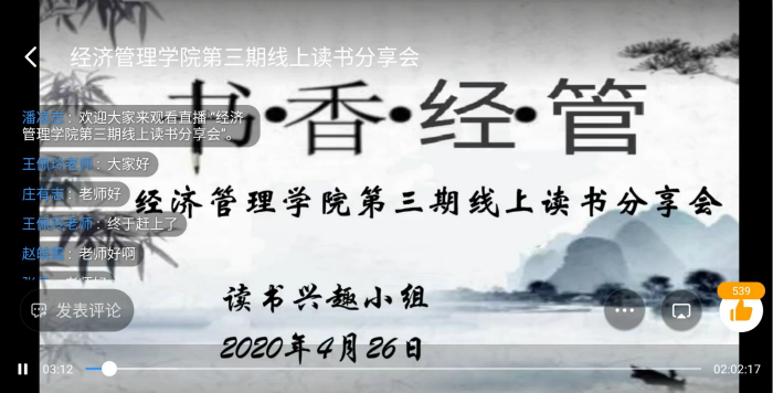 据悉,此次线上读书分享会是该院培育和践行经管人精神系列活动之一,也是该院打造书香经管品牌活动之一,旨在培育学生文化情怀,引领学生品经典、读好文、悟人生。