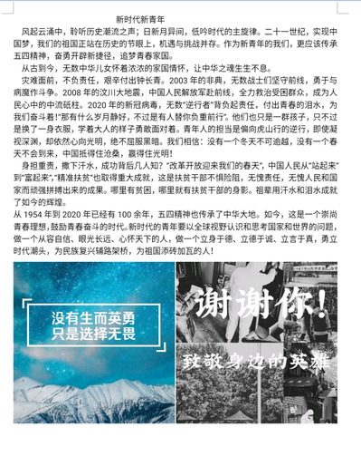 团员青年收集身边的战“疫”故事,将其以文稿形式记录下来,分享到线上平台并发表感想,通过本次活动,让同学们看到身边榜样所蕴含的精神品格,激励广大青少年见贤思齐,培养无私奉献的精神。