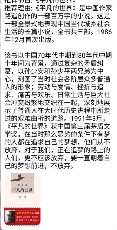 本次活动要求同学们在活动期间围绕自己选择的书籍进行交流并发言。《墨菲定律》告诉大家在力所能及可以预料到的情形下,做出最好选择和充足的准备;《平凡的世界》让大家从书籍中获得激励,做人做事不能放弃。活动期间同学们都积极参与,踊跃发表自己的感想,激起了同学们浓厚的读书兴趣。