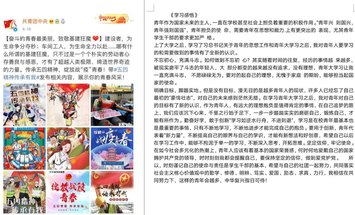 五四青年节到来之际,化学化工学院陆续开展“绽放战‘疫’青春 ·坚定制度自信”主题系列活动。