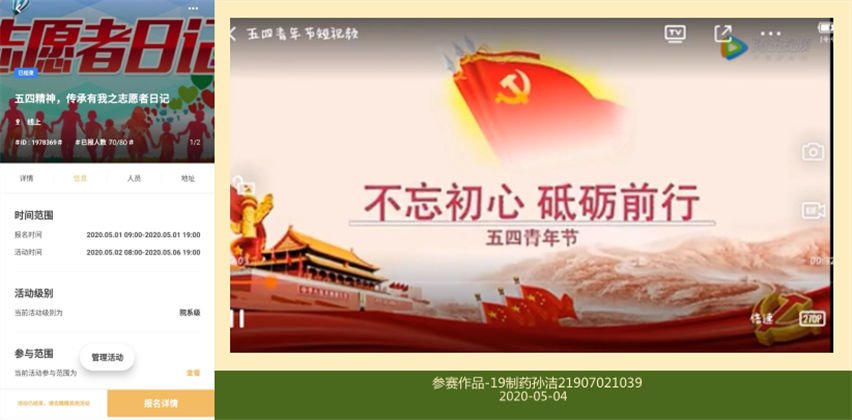 5月4日,该院开展了志愿者日记活动。参与者通过短视频,微纪录片,或者vlog的形式记录志愿者抗疫服务的身影。同学们热心服务社区,用实际行动弘扬五四精神,绽放战疫青春。通过此次录制志愿者服务视频活动,让同学们能够在防控疫情期间,再次感悟志愿服务精神,回归志愿服务初心。