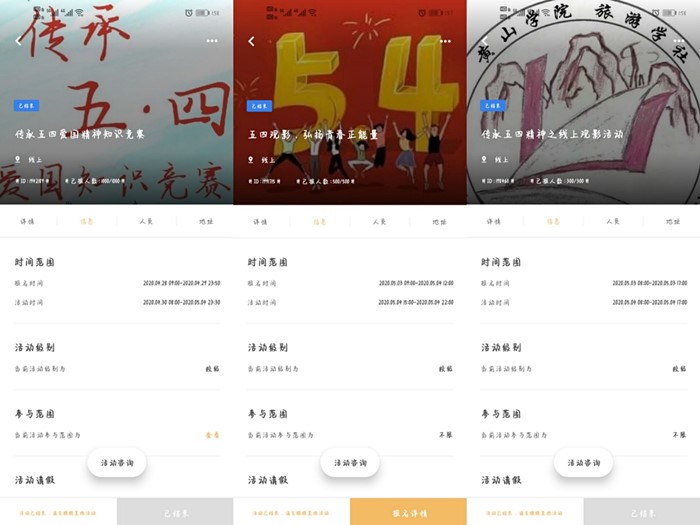 以文为翼,声临五四。由我校电子商务协会主办,国贸学社协办的“青春有我,共话五四”主题活动以演讲、短视频、图画三种形式展开,同学们围绕活动主题进行构思创作,充分挖掘五四精神的时代内核;青鸟爱心协会举办“传颂五四青年梦”活动,旨在增强我校青年学子的爱国情感和对革命先烈的敬佩之情,促进中国梦与青年梦相辅相成;大学生英语俱乐部举办“英语配音忆五四”活动,让参与者通过英语配音的方式讲述五四故事,在锻炼英语口语的过程中加深对五四历史的了解和感悟;旅游服务技能社、素质拓展协会纷纷举办五四青年节朗诵比赛,旨在引导广大青年继承和发扬五四精神,为同学们提供了一个展示自我、锻炼自我、提升自我的平台。