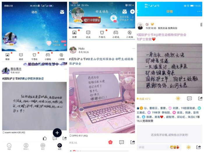 自新冠肺炎疫情发生以来,广大医护人员用实际行动诠释了救死扶伤、甘于奉献的崇高精神。他们是逆行的战士,是生命的守护者。国际护士日当天,学生需要按照活动要求在QQ空间上发布一条关于宣传国际护士日的说说,配上饱含感恩与祝福的手写图片或视频,截图保存后提交至活动举办方。