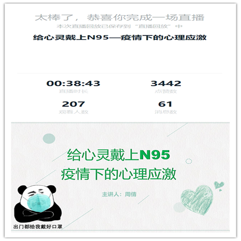 周倩围绕什么是应激、应激过程、疫情应激特点以及应激反应等四个方面阐述了在疫情期间我们该怎么办、如何进行自我心理调节进,指出了几点心理误区以及调整手段。周倩表示,在疫情期间,同学们要学会调节自我情绪,调整心态,用一种积极向上的态度去面对现实,积极寻求专业帮助。