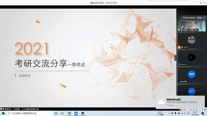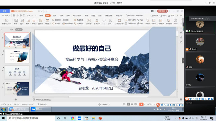 本次交流会通过腾讯会议网络平台进行了线上经验分享。张影介绍了疫情防控常态化下的安全就业、考研形势以及学院2020年考研现状。会上,优秀的考研学生代表和实习生代表分别从考研学校选择、复习方法、考研心态、复试与调剂、实习与就业等方面分享了自己的经验。吴永祥对2020届食品科学与工程专业考研和就业学生取得的优异成绩给予了高度肯定,并告诫同学们要提前做好准备,进一步提高专业水平和实践能力。