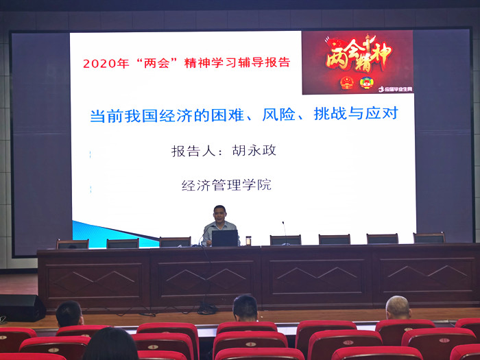 胡永政围绕2020年《政府工作报告》工作要点“稳就业保民生,坚决打赢脱贫攻坚战,努力实现全面建成小康社会目标任务”这一主题,结合专业知识,坚持用全面、辩证、长远的眼光看待当前的困难、风险、挑战,运用数据与案例分析了我国经济韧性强、经济潜力大与回旋空间足。报告详细解读了做好“六稳”实现“六保”的主要工作目标,并从当前主要宏观经济政策和“新基建”政策引领中国产业未来发展等方面分析中央当前经济应对之策。报告指出,在以习近平同志为核心的党中央的坚强领导下,我们有坚定应对当前严峻经济形势的信心。2020年注定是不平凡的一年,我们作为高校教育工作者,一定要谨遵习近平总书记的教导,科学分析形势、把握发展大势,坚持用全面、辩证、长远的眼光看待当前的困难、风险、挑战,立足岗位,勠力同心,为完成2020年目标任务尽一份情,出一份力。