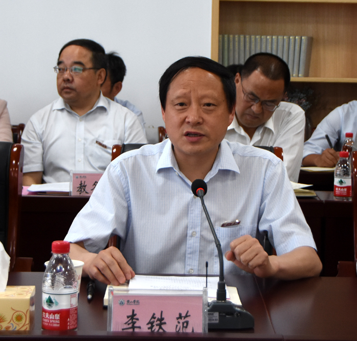 党委副书记、校长李铁范代表学校作了合格评估整改工作汇报,他从学校办学历史和发展现状、学校本科教学的基本情况、合格评估的整改情况、存在的问题和努力方向、取得成效以及后续工作的部署安排等方面出发,坚持自查工作要对标对表,突出整改落实的成效。他指出,学校坚持以习近平新时代中国特色社会主义思想为指导,深入贯彻落实全国全省教育大会精神,始终坚持以党建促事业发展,坚持将合格评估和审核评估整改一体推进,坚持科学发展是第一要务、人才资源是第一资源、改革创新是第一动力,从严治校,从严治教,从严治学,以提升质量为主题,以内涵发展为主线,进一步巩固本科教学工作的中心地位;坚持“立德为先、立学为基、能力为重、全面发展”的原则,不断提高人才培养的质量和水平,努力实现有灵魂的质量提高、有方向的水平引领、有坐标的内涵发展,扎实推进地方应用型高水平大学建设,提升服务地方经济社会发展的能力和水平。