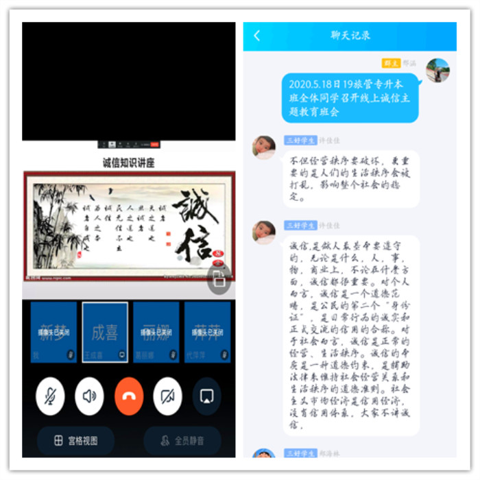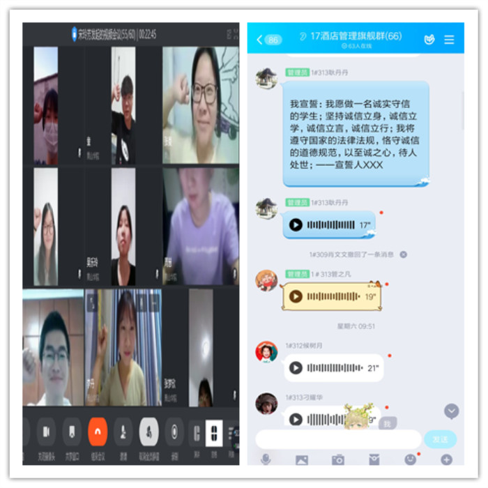 该院各班级通过多种方式做出诚信承诺,积极组织开展诚信宣誓、诚信签名活动。18酒店管理班学生通过钉钉线上视频会议集体进行诚信宣誓,18中韩班学生通过QQ空间分享诚信宣言,17酒管班学生通过QQ语音线上宣誓,18会展班级自发组织签订诚信承诺书等等,这些承诺时刻警醒着同学们要做一个诚实守信的大学生。