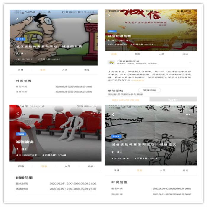 该院各班级大胆创新活动形式,积极筹办开展诚信教育知识竞赛、诚信征文比赛、诚信教育演讲比赛、诚信故事分享、诚信图片展览、评选诚信之星等活动,寓教于乐,使同学们在活动中获取知识,在分享中交流想法,在欣赏中暗下决心。