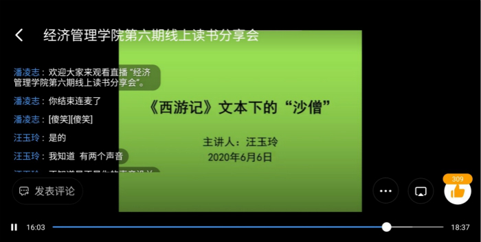 汪玉玲以“《西游记》文本下的沙僧”为主题,通过视频播放和PPT演示两种形式,分享了对古典名著《西游记》(吴承恩著,人民文学出版社)的读书心得。她分别从《西游记》文本的成书历程、作者个人介绍、“沙僧”人物形象分析等三个方面,阐述了《西游记》的艺术价值和写作特征。她认为,“沙僧”具有目标坚定、深谙人情、大局意识等性格特征,是《西游记》文本中不可忽略的人物角色。黄保玉同学以申请连麦方式对汪玉玲的分享内容作出点评,并阐发了个人阅读思考。