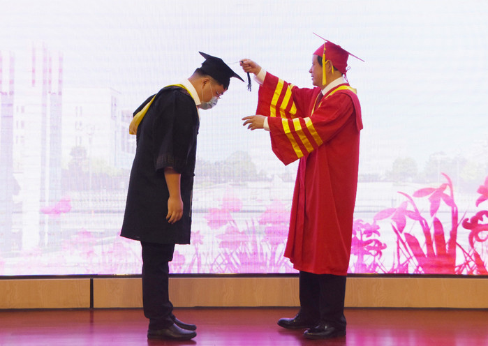 党委副书记、校长李铁范给2020届本科毕业生代表拨正流苏、颁发学位证书。